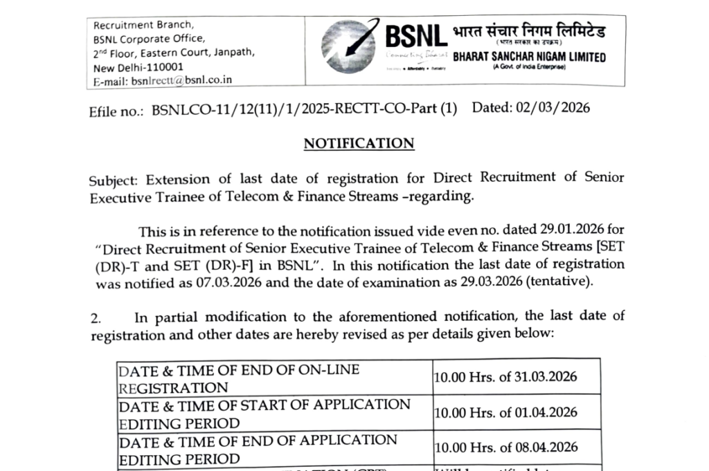 BSNL Recruitment 2026 | Salary Rs 24900 to 50500 | Last Date – 31-03-26 | Central Govt Jobs 2026